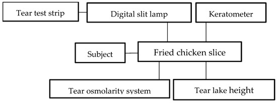 Figure 2 shows a block diagram of the experimental system used in this study, which comprised four types of measurement equipment: a tear test strip, a digital slit lamp, a keratometer, and a tear osmolarity system. The production process for the fried chicken slices used in the experiment was as follows: Low-gluten flour and corn flour were mixed in a ratio of 3:1 to make a frying powder, then egg white and water were added and the batter was mixed well.egetables and fruits were cut into pieces, and the meat was marinated; all ingredients were cut into small pieces or slices to avoid the food being difficult to fry. After coating the ingredients with batter, they were fried in a pan. The oil temperature in the pan used for frying French fries was maintained at 180 °C. The corneal curvature data obtained with the keratometer was used to determine whether the subject’s astigmatism was corneal astigmatism or axial astigmatism, and whether the myopic structure was refractive or axial, so as to determine whether each subject needed to wear hard or soft contact lenses.