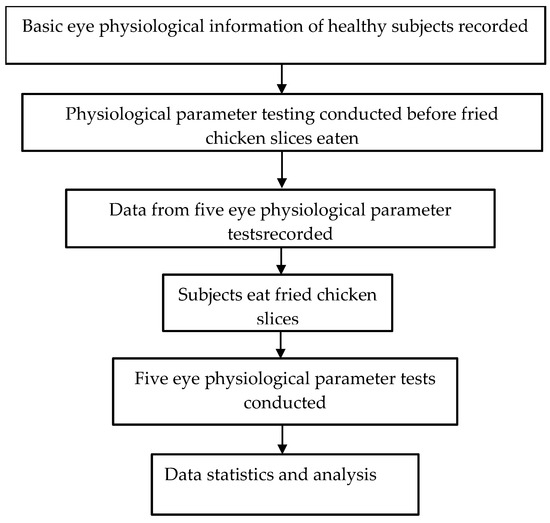 The entire experimental process is shown in Figure 3, including the recording of basic eye physiological information of healthy subjects, the five eye physiological parameter tests carried out before the subjects ate the fried chicken slices, the five eye physiological parameter tests carried out after the subjects ate the fried chicken slices, data statistics and analysis, and the diagnosis of dry eye syndrome [11,12].