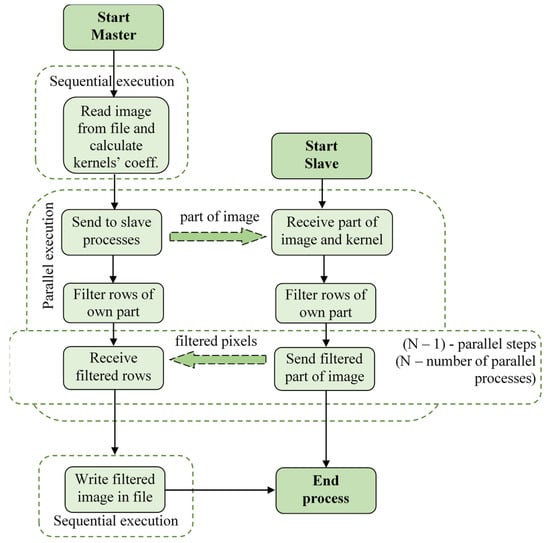 The Master process is responsible for managing the parallel calculations, so it executes those reading and writing operations related to the input and output images and distributes parts of the input image among the slave processes, together with its self-calculated Gaussian kernel coefficients. When every process has its own part of an image, it can start to filter it until, finally, all the filtered parts of the image are combined by the Master process to produce an output image.