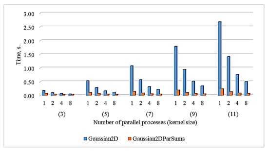 The time complexity of all the discussed algorithms depends on image size (N is the number of all pixels in the input image) and kernel size (denoted as M). It is assumed that the processed image has a square form, and, because of this, the number of pixels in one column is the square root of N. When the size of an image is large, it can be supposed that the time complexity of the algorithm Gaussian2DParSums will be approximately equal to the time complexity of the algorithm Gaussian1D. It can be observed that if the size of the image is a constant, then the time complexity has a linear relationship with the kernel’s size for the algorithm Gaussian1D, a quadratic relationship for the algorithm Gaussian2D, and a nearly linear relationship for the algorithm Gaussian2DParSums.