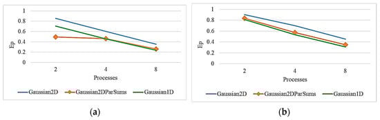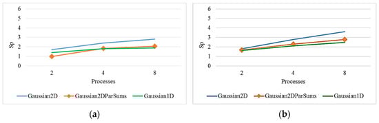When filtering the images with the developed algorithms, the time needed was measured. The execution time of the algorithms was tested with different numbers of parallel processes, using 1, 2, 4, and 8. Every image was processed 10 times with the selected parameters (algorithm, kernel size, and number of parallel processes). The obtained results were averaged for all images at each combination of selected parameters and are presented in Figure 2. It is evident that when the kernel size increases, then the time for processing increases too, and this increase is significant for the algorithm Gaussian2D and smaller for the algorithm Gaussian2DParSums, which corresponds to their theoretical time complexity evaluations. It can be seen that the increasing number of parallel processes leads to a decreasing amount of time being needed for filtering, which can be explained by the utilization of available computational cores. The speed-up factor and the efficiency of parallel execution were calculated based on the measured times. Figure 3 and Figure 4 graphically represent the values when processing the smallest and largest images with the developed algorithms, using different kernel sizes.