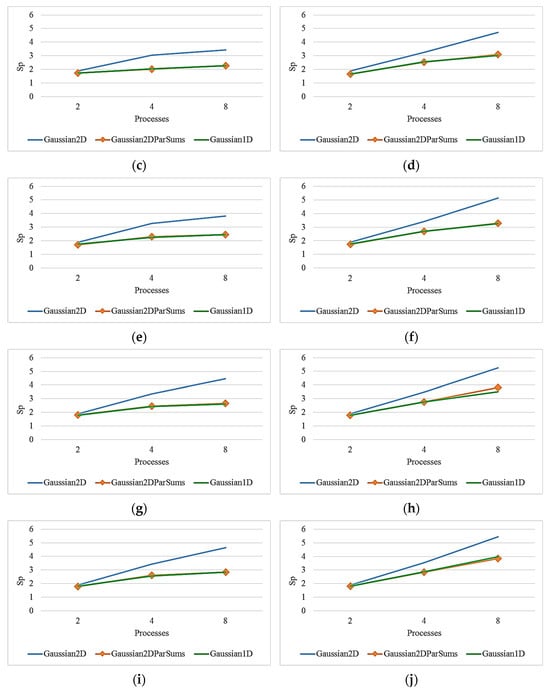 Speed-up factor for parallel execution: (a) waterliliya kernel size 3; (b) old_Nessebar kernel size 3; (c) waterliliya kernel size 5; (d) old_Nessebar kernel size 5; (e) waterliliya kernel size 7; (f) old_Nessebar kernel size 7; (g) waterliliya kernel size 9; (h) old_Nessebar kernel size 9; (i) waterliliya kernel size 11; (j) old_Nessebar kernel size 11.