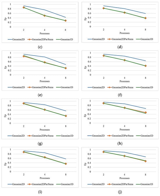 Efficiency of parallel execution: (a) waterliliya kernel size 3; (b) old_Nessebar kernel size 3; (c) waterliliya kernel size 5; (d) old_Nessebar kernel size 5; (e) waterliliya kernel size 7; (f) old_Nessebar kernel size 7; (g) waterliliya kernel size 9; (h) old_Nessebar kernel size 9; (i) waterliliya kernel size 11; (j) old_Nessebar kernel size 11.
