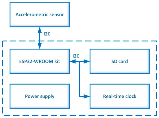 The main components include a 32-bit microcontroller ESP32 manufactured by Espressif Systems (Shanghai, China). It has sufficient memory, an SD card for data storage, a real-time clock to determine the start time of the measurements, and a power supply, necessary for the operation of the device. An external accelerometric sensor is connected to the device, which is mounted on the object where the vibrations would be measured and analyzed.
