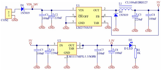 The power supply of the developed system includes a switching regulator, LM2576 (Texas Instruments, Dallas, TX, USA), which provides a 5 V supply voltage to the board. In addition, a second regulator (LM1117, Texas Instruments, Dallas, TX, USA) supplies 3.3 V to the individual components that are connected to and communicate with the ESP32 microcontroller.