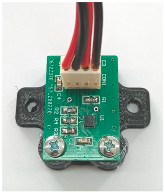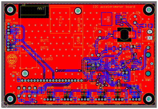 To test the functionality of the developed device, an accelerometer module was created, based on the LIS3DHTR accelerometer produced by STMicroelectronics (Geneva, Switzerland). The LIS3DHTR is a three-axis MEMS accelerometer with digital output, developed by STMicroelectronics. It is intended for applications requiring low power consumption and high performance. Its measurement ranges are ±2 g, ±4 g, ±8 g, or ±16 g, with a sensitivity of 64 mg. The accelerometer supports I2C and SPI digital interfaces; in our case, the I2C interface was used. LIS3DHTR is suitable for a wide range of applications, such as free-fall detection, single-/double-tap recognition, vibration monitoring and detection, etc.
