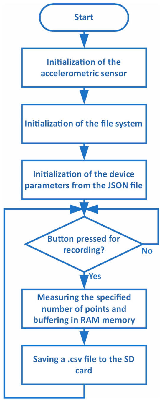 Figure 9) includes a sequence of steps in which the accelerometer is initialized, a file system is created on the SD card, and the system parameters are loaded. After this, the system enters a standby mode. Upon the press of a button by the user, the data measurement begins. The number of points to be measured and the time delay between two consecutive measurements are stored as parameters in a JSON configuration file. Based on this data, the system dynamically allocates a buffer in RAM memory, where the measurements are sequentially recorded. Once all the designated points are collected and the buffer is filled, data is saved to a .csv file on the SD card. This file has a unique name that includes the date and time of the measurements.