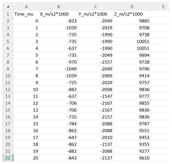 Using the developed accelerometer module, data collection was performed. During the data collection process, the board’s configuration and operating modes were set through parameters specified in the JSON configuration file located on the SD card. The collected vibration data was stored in a separate .csv file for each measurement.
