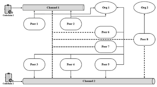 The Hyperledger Fabric platform is used for the implementation of the model. All peers hold a copy of the channels to which they have access (in this case, there are two channels). Peers initiate transactions and send them to the nodes that store a copy of the blockchain and the current state of the data.