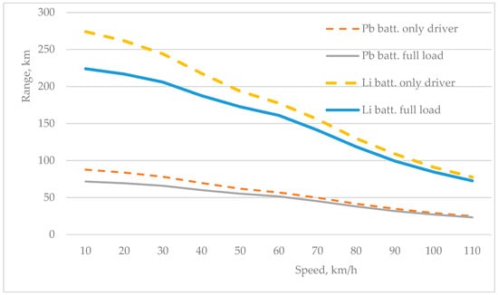 The range is also calculated at different speeds and loads for two types of batteries—using budget lead (Pb) batteries or LiFePO4 batteries with the same mass mbatt = 90 kg. The obtained values are shown in Table 1, columns 12 ÷ 15.