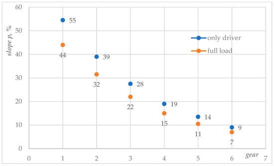 The obtained values for the maximum climbed slope with only a driver and with full load in the different gears are systematized in Table 3 and shown graphically in Figure 2. In Table 3, they are compared with the maximum traction force Fwm and the resistance force FΨ.