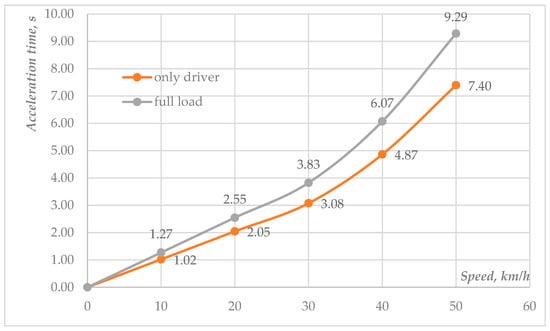 From the total acceleration time, the average acceleration from 0 to 50 km/h can be found using Equation (17). The obtained values for acceleration a and acceleration time Δt for each speed interval (from V1 to V2) are systematized in Table 4.