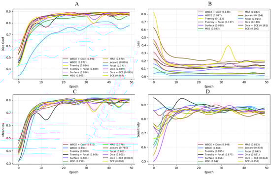 Validation performance curves for different loss functions: (A) Dice coefficient, (B) loss, (C) mean IoU, and (D) sensitivity.
