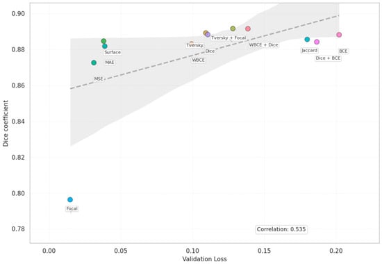 Correlation between validation loss and Dice coefficient across different loss functions.