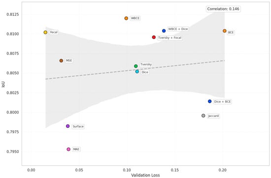 The chart in Figure 2 indicates a weak positive correlation between validation loss and Dice score with an estimated correlation coefficient of 0.32. Loss functions such as Tversky + Focal and WBCE + Dice achieve high Dice coefficient scores despite higher validation losses. In contrast, MAE, Surface, and MSE show low loss values, but moderate Dice results. Focal loss is considerably different, having the lowest loss and the lowest Dice coefficient score, confirming that loss mitigation does not directly lead to segmentation accuracy. The correlation between validation loss and IoU for the estimated loss functions is shown in Figure 3, providing a comparative analysis of segmentation consistency relative to error magnitude.
