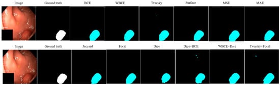 Most loss functions provide consistent localization, although there are slight differences in the accuracy of boundary detection and the number of false positives. Loss functions such as WBCE, Dice, WBCE + Dice and Tversky + Focal demonstrate more accurate localization. These features allow for better separation of the polyp from the mucosal background compared to the standard BCE or Focal.