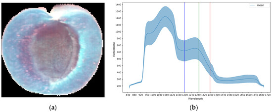 After obtaining the hyperspectral images, they were preprocessed by taking them one by one and removing the background as it is shown in Figure 3a. It illustrates a representative sample element, showcasing the mean spectrum characteristic and the range of change in spectral reflectance across the entire surface of the image in Figure 3b.