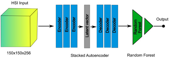 In this study, a Stacked Autoencoder in combination with Random Forest was implemented for regression. For training the SAE network, the “Adam” optimizer and Root Mean Square Error (RMSE) loss function with a learning rate of 0.001 and batch size of 8 are used. Once the training was completed, each pixel in the HSI dataset was encoded by using only the encoder part of the SAE architecture to obtain the reduced dataset, and the output was fed to the Random Forest regressor. The architecture of the Stacked Autoencoder with Random Forest regression used in this research is shown in Figure 5.