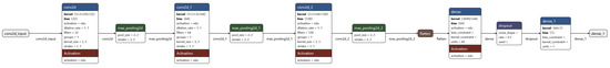 The 2D convolutional neural network (2D-CNN) was developed to model the spatial variability in the hyperspectral images while reducing spectral dimensionality through prior averaging across bands. Specifically, each image sample was preprocessed by averaging, resulting in a 2D input matrix per sample. The resulting spatial maps (e.g., of size 150 × 150) were used as input to the network. The architecture of the network is shown in Figure 7.