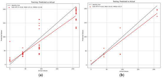 The combination of Stacked Autoencoders (SAEs) and Random Forest (RF) was used to improve prediction accuracy by learning complex patterns in the data. The model was trained on mean-spectrum hyperspectral data. The results from training and testing are presented in Figure 10. The SAE-RF model achieved satisfactory performance, with Rt2 = 0.82 and Rp2 = 0.83, indicating minimal overfitting or underfitting. The MAE and RMSE values were MAEt = 23.12, MAEp = 24.03, RMSEt = 32.46, and RMSEp = 30.17, respectively. The similarity of these values suggests that the model performs consistently across both the training and testing datasets.