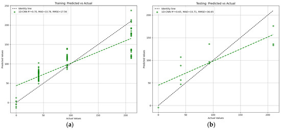 Figure 11. Predictive models for 1D-CNN: (a) training; (b) Testing.
