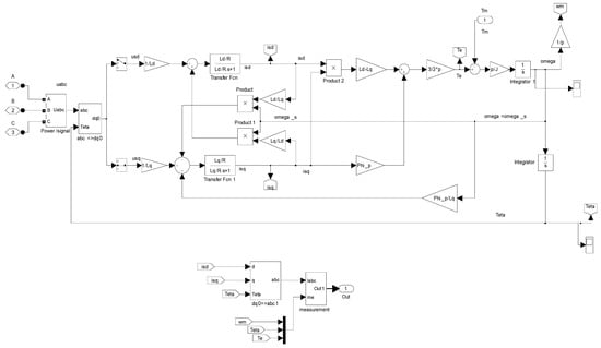 A model of the PM machine in motor operating mode, built in Simulink/Matlab® from Equations (2)–(5), (12) and (16), is shown in Figure 1.