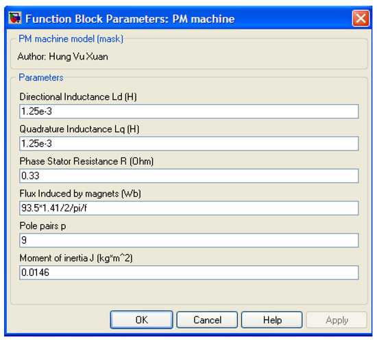 Figure 2 is the interface menu built to enter data of the PM machine. Almost all parameters of the PM machine in Figure 2 have been estimated and validated by experiments, except for the inertia moment, which is an assumption-based calculation. The magnetic flux produced by magnets was calculated and validated using the experimental electromotive force.