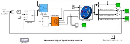 PM machine controlled by the rotor magnetic field-oriented inverter simulated in Simulink/Matlab; the outer loop is the speed loop and the inner loops are dq current loops. PM machine’s block: inputs of the model are three-phase voltage uabc and outputs of the model are mechanical angle speed ωm, current iabc, and electromagnetic torque Te.