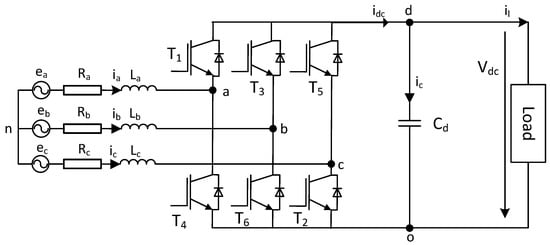 In this section, the modeling of an AC/DC converter with voltage-oriented control (VOC) is investigated. Figure 4 presents a simple equivalent circuit of a PMG working with an active rectifier load. The PMG is replaced with a three-phase electromotive force (EMF) system and inductances including resistances. We assume that the three-phase EMF system is symmetrical, so that the inductance of a phase is identical: La = Lb = Lc = L and resistance Ra = Rb = Rc = R. The dropped voltage on the switcher is ignored and the commutation of switches is neglected.