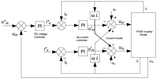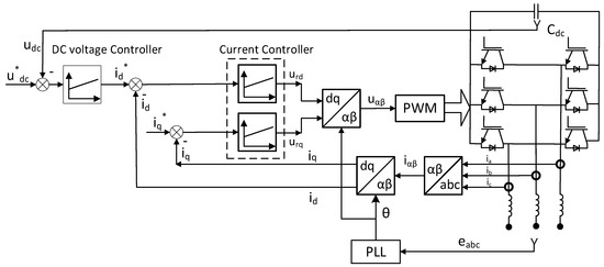 Figure 7 presents the control construction of an active rectifier for a generator in standalone mode. The measured DC voltage is used as a feedback signal for the DC voltage control loop. The currents id and iq are independently controlled together. Three-phase currents iabc of the generator are measured, and are then converted into αβ components in a stationary coordinate using Clarke’s transformation and dq current components in RFC using Park’s transformation, which are used for current signal feedback in current control loops. For coordination conversion from the abc coordinate to the dq coordinate, the θ angle is determined by using Phase-Locked Loop (PLL). The input of the PLL block is from the generator three-phase voltage uabc, which is measured before inductive filtering. It is worth mentioning that for better performance in terms of maximum generated power and eliminating inductive hard filter but with more complications, the generator three-phase voltage and current are measured. After that, the fundamental voltage and current are obtained via a software filter, and finally electromotive forces (EMFs) are calculated from the voltage-balanced equation. The calculated EMFs are used as the input of the PLL block. The structure and parameters of the PLL are determined as in [18,19,20,21].