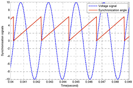 It can be seen from Figure 12 that the θ angle, output signal of the PLL block and a triangle signal synchronize to the voltage signal of phase a and vary from 0 to 2π in one voltage cycle. This figure also shows that the PLL block works well to meet the requirements for synchronization. This requirement is crucial for voltage-oriented control.