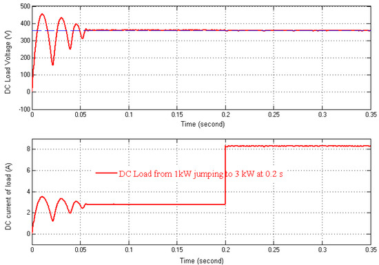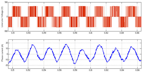 Figure 13, Figure 14 and Figure 15 show some simulation results of the PWM converter–PM generator system. Figure 13 shows the DC voltage and current during charging and steady state. It also shows that DC voltage is kept constant and follows the setting value with negligible error in steady state, even with load jumping from 1 kW to 3 kW at the moment of 0.2 s in the simulation. It can be seen from Figure 14 that the phase EMF and phase current are in phase unity. Figure 15 shows the PWM voltage and current of the active converter. All simulation results prove that the parameters of current and dc voltage controls are well estimated.