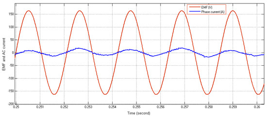 The main parameters concerning DC capacitor, PMM inductance, rated no-load voltage (EMF), switching frequency and sampling time for simulation in Figure 8, Figure 9, Figure 10 and Figure 11 are as follows:
