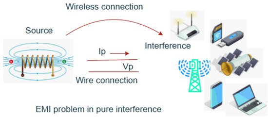 On the one hand, this is electromagnetic interference (EMI). The concept includes the potential danger of mutual parasitic influence between communication devices and communication channels during their operation. A similar danger exists in all modern wireless and wired systems and for all devices in them [1,2]. Any device with a certain function from a given system can have an unacceptable effect on another device from the same system or from another system, and vice versa. Therefore, each device and system must be designed so that this parasitic EMI influence in both directions is minimal. The most common situation of electromagnetic interference in communications is the following: a given “EMI source” causes parasitic effects in a given “victim device” (disturbed device) [2,3]. This can happen either via a “wired” connection, or via a purely electromagnetic (wireless) connection, or both. An example is shown in Figure 1.