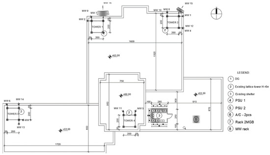 - Three-phase power supply from the public electricity grid—The national electricity grid is used for the main power supply in normal operation. The control panel connecting the site to the “external” power supply is additionally equipped with a connection socket and a manual switch for adding a backup portable generator to the system in case of a failure in the main one. You can see an example in Figure 11.