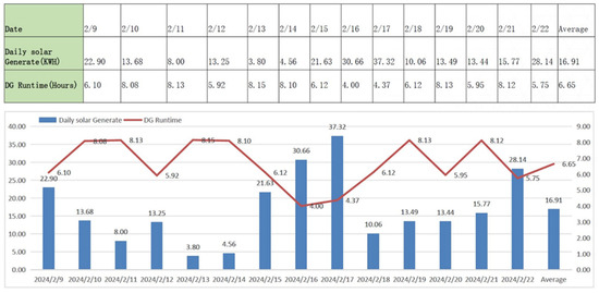 A graphical representation of the base station’s power consumption is shown in Figure 13. The energy is taken from installed PV panels that produce during the day. The unused energy is stored in batteries. When necessary, the batteries, which are pre-charged, are switched on.