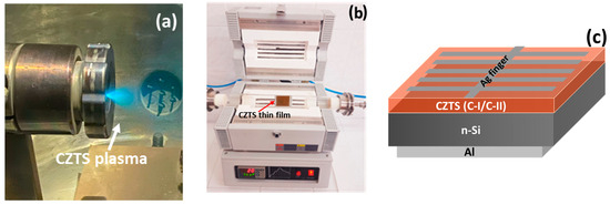 The laser beam (Continuum Minilite NdYAG laser; Electro-Optics, Inc.; Santa Clara; CA; USA (1064 nm wavelength, 15 mJ laser energy, 10 Hz repetition rate, 5 ns pulse width)) with two different laser pulse numbers ablated the CZTS sputtering target and the CZTS species deposited separately on the microscopic glass and n-Si wafer substrates at room temperature under 1 × 10−6 mbar of vacuum pressure. A photograph of the plasma formed by laser beam ablation is shown in Figure 1a. The procedure used to clean the substrates was described in our previous study [16]. The CZTS ultrathin films produced with 2.400 and 12.000 laser pulse number are named C-I and C-II. Afterwards, these ultrathin films were placed next to 50 mg of powder and annealed in a vacuum environment at 375 °C temperature, as seen in Figure 1b.