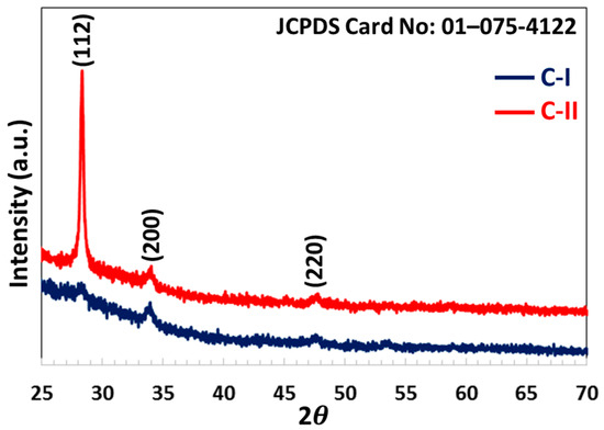 The crystal structure of C-I and C-II ultrathin films is shown in the crystal pattern in Figure 2. The thin films are crystallized in (112), (200), and (220) orientations on angles, respectively, and have a tetragonal and polycrystalline crystal structure [21,22]. The C-I ultrathin film deposited with low laser pulse number has a weak crystal structure. While the main peak intensity in the (112) orientation is very low, the peak intensity of the (200) crystal orientation is high due to the low formation energy. As the deposition rate of atoms ablated from the CZTS sputtering target that increased with high laser pulse numbers, the atoms arranged more ideally, improving C-II ultrathin film’s crystal structure and the intensity of the main peak increased significantly [23]. The minority charge carriers in the more developed crystalline C-II ultrathin film are less likely to recombine in defects and traps, resulting in higher charge lifetimes.