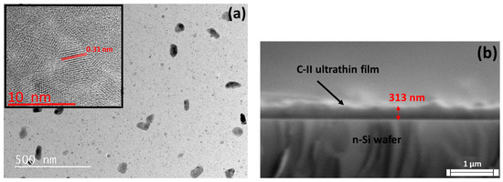 The HR TEM image in Figure 3 indicates that the CZTS ultrathin film has a developed crystal orientation. The space between the crystal orientations was determined as 0.31 nm [24]. SEM images in Figure 4a,b show that the particle sizes and numbers forming the C-II ultrathin film are larger and denser than those of C-I. The number of atoms deposited side by side and on top of each other, which increases with augmentation laser pulse numbers, and this causes the atoms deposited on the substrate to combine with each other, leading to an expansion in the particle size [15,16,25,26]. The ultrathin films are composed of partially inhomogeneous particle. Since the number of deposited atoms is higher and the particle size is large, the thickness of the C-II-ultrathin film is upward of than that of C-I, and the thickness of C-II thin film is shown in the SEM cross section image in Figure 3b.