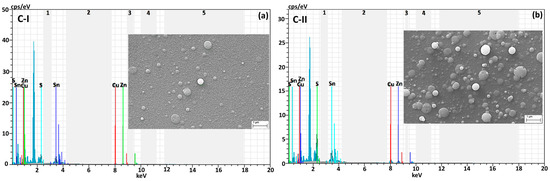The EDX Spectra in Figure 4 and Table 2 that show the elements’ atomic weight ratios that form the C-I and C-II ultrathin films. These ultrathin films are Sn and Zn rich, Cu poor [27,28]. While CZTS sputtering targets are ablated with low laser energy, the amount of Cu is slightly low in the ultrathin films due to the possibility of the laser fluency remaining below the Cu threshold value [27]. The amount of Sn was determined to be slightly higher because the Sn element atoms diffused to the ultrathin film surface to evaporate at the annealing temperature of 375 °C [29]. However, the ultrathin film’s stoichiometric structure developed with the high in film thickness and a more ideal composition ratio was approached.