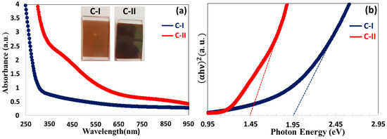 C-II ultrathin film has higher photon absorption from UV to visible region compared to C-I, in the absorption graph in Figure 5a. Since the C-II thin film consists of larger particles and has a higher thickness, it absorbs a higher amount of photons and is darker in color (insert square in Figure 5a). In contrast to this situation, C-I, which is more transparent in color, has low photon absorption due to its low thickness [15,16]. The band gaps () of C-I and C-II ultrathin films, which were found to be 1.95 eV and 1.45 eV from the energy band graph obtained using the Tauc equation of [15], respectively. The high-photon absorbing C-II ultrathin film is in the lower band gap and has suitable optical properties to employ as an absorber layer of solar cells.