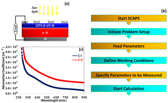 (a) Ag/CZTS (C-II)/n-Si/Al solar cell diagram; (b) working steps of SCAPS-1D simulation program; (c) absorption coefficient spectra of C-I and C-II ultrathin film.