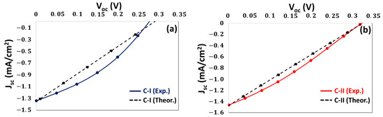 Comparative curves of experimentally measured and theoretically calculated PV parameters of C-I and C-II solar cells are given in Figure 7. Theoretical/experimental PV data of these solar cells are presented in Table 4. The experimental/calculated data are found to be somewhat close to each other, which shows that the solar cells operate reliably [11,15,16,32]. According to the experimental parameters, the efficiency of the C-II solar cell is much higher than that of the C-I solar cell. The improved crystal structure of the C-II thin film indicates that the number of grain boundaries and the number of traps and defects in the CZTS thin film are lower. Therefore, since the lifetime of the minority charge carriers in the C-II-ultrathin film is longer, charge transitions also occur easily. Thus, the charge accumulation in the contact areas at the boundaries of the depletion region increases, resulting in an enhancement in Voc and Jsc values. Some functional studies have been carried out on C-II solar cells, and several such studies are described below.