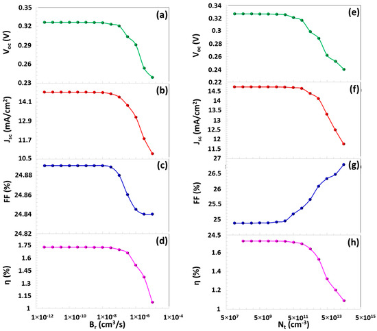 Voc, Jsc, FF and η parameters depending on (a–d) Br and (e–h) Nt values.