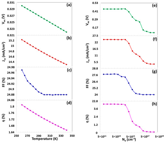 Voc, Jsc, FF, and η parameters depending on (a–d) operating temperature and (e–h) Na values.