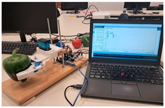 Figure 2 depicts the prototype smart gripper, grasping a sweet bell pepper, while connected to a laptop during programming and testing. Figure 3 illustrates the force sensor being used (left part) and the concurrent amperage consumption and force measurements recorded using the Serial Plotter component of the Arduino IDE environment. The force values have been multiplied by a factor of 10 for better inspection, while the corresponding vertical axis (in N units) has been added on the far right. Current values close to the 500 mA level (horizontal line) result in forces close to 25 N. Both measured and estimated (via the calculated amperage–force relationship) force values are plotted in Figure 3 (i.e., the two lower curves).