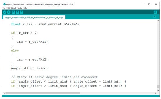 Efficient gripper compliance with the force thresholds, which are determined and monitored dynamically and indirectly via the amperage readings, requires the establishment of an appropriate control mechanism. This mechanism should be able to reach the desired force value comparatively quickly and maintain it (without significant fluctuations) for the time required to place the fruit, e.g., into the harvesting pallet bin. Initially, this mechanism was implemented through deterministic incremental steps up to the cut-off force value. Performing a short time averaging/smoothing of the current values before feeding them to the control algorithm was a welcome performance amelioration. The next step was to implement a dynamic PID (Proportional–Integral–Derivative) control strategy to shorten response times. Experiments showed that a control policy exploiting the integral PID component and minimizing corrections to negative errors could provide satisfactory results. Figure 5 shows an indicative code part implementing a control method variant for the embedded logic of the gripper, using the Arduino IDE development environment. For improved performance, the algorithm handles positive and negative errors asymmetrically, as different coefficients are utilized (Ki1 and Ki2, respectively). The role and the performance of the components is further clarified in Section 3.