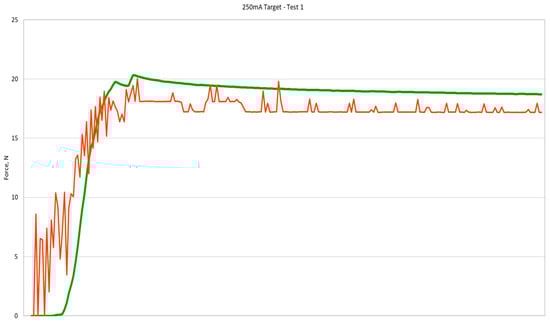 Finally, Figure 9 and Figure 10 illustrate the good limit-following behavior of the proposed system in gripping sweet bell peppers, for the 250 mA and the 500 mA targets, respectively (i.e., close to the 17 N and the 24 N force thresholds). Both estimated and actual force curves are shown. The force–amperage relationship being described had an R2 metric equal to or better than 91.92, for all relevant force threshold prediction equations. For simplicity purposes, in all the above cases, the suitable force/amperage threshold values were provided via a rotary potentiometer connected to the Arduino Uno microcontroller.