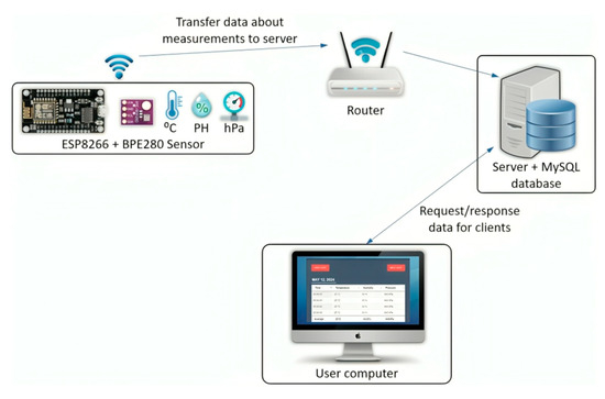 - Microprocessor system consisting of ESP 2866 microcontroller and BPE280 sensor measuring various parameters (temperature, humidity, and pressure). BPE280 sensor measures parameters in raw form and transmits data to ESP 2866. In ESP 2866, measurements are converted into an understandable data type. Then, ESP 2866 sends the converted data to a server via wireless connection via Wi-Fi;
