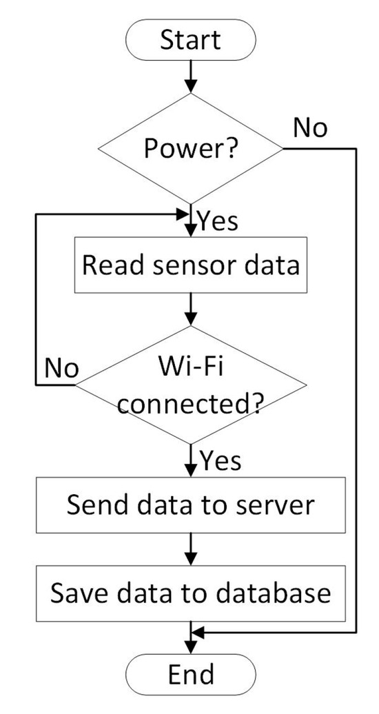 - Server and database—the server has two functionalities. One is to receive measured data from ESP 2866 and store them in a database. The other functionality is to receive requests from the client application and send the data;